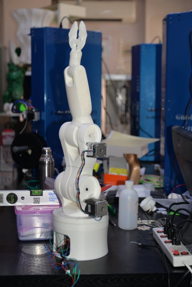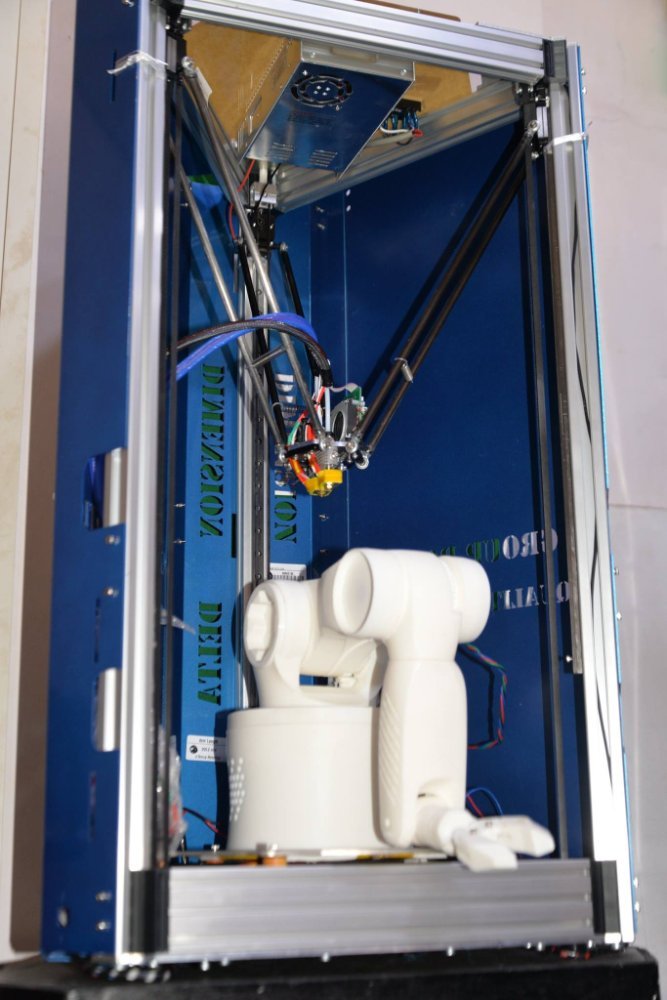J Group Robotics 3D printed a robot Inspired by kuka robots. This robot has 6 axis of freedom out of which 3 are motorized using stepper motor and controlled using Ramps. This robot moves on Gcode. firmware marlin. This was printed @200 microns with Dimension Delta 3D printer .