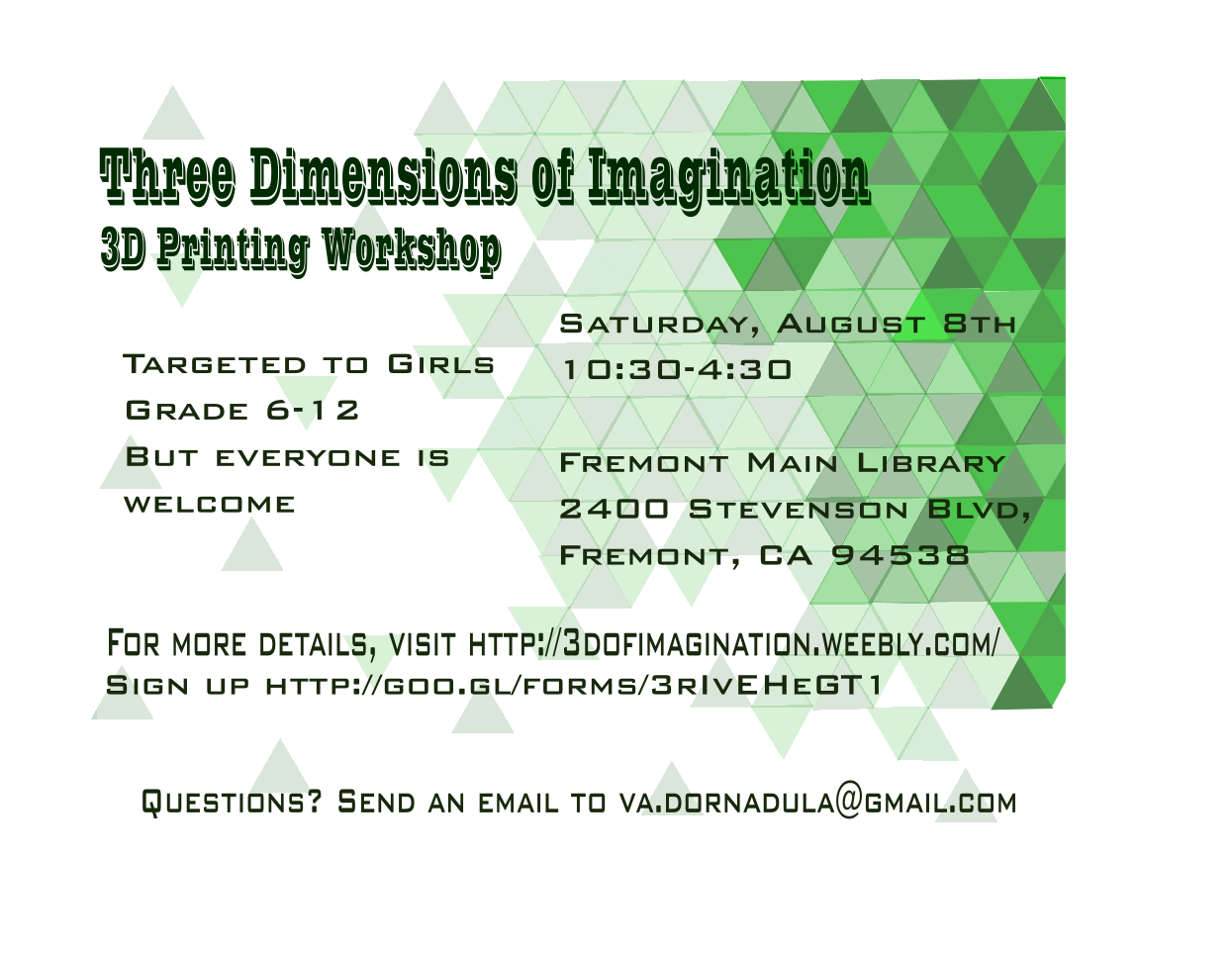 Come out to ‘Three Dimensions of Imagination’, a 3D Printing workshop on August 8th from 10:15-4:40 that introduces people to 3D printers, modeling software, and many applications of 3D Printing. Explore the use of 3D Printing in both bio engineering and aerospace engineering. Learn how to create and 3D Print objects from start to finish. Participate in a debate about 3D Printing and design challenges. The event is targeted towards girls in junior high school to high school (Grades 7-12), but everyone is welcome. Sign up soon because there are only 10 spots available and we accept on a first come first serve basis.