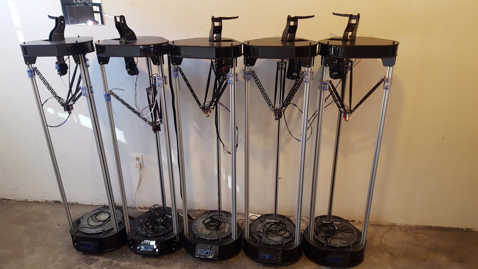 For sale are 5 SeeMe CNC Rostock 3D printers with an extended build height that is almost double that of a stock Rostock. 4 of the printers have an E3DV6 with a .8 nozzle and 1 has an E3DV6 with the Volcano Eruption package and a 1.2 nozzle. The printers are located in San Francisco 94107. If you got any questions please feel free to post them below. Thanks!