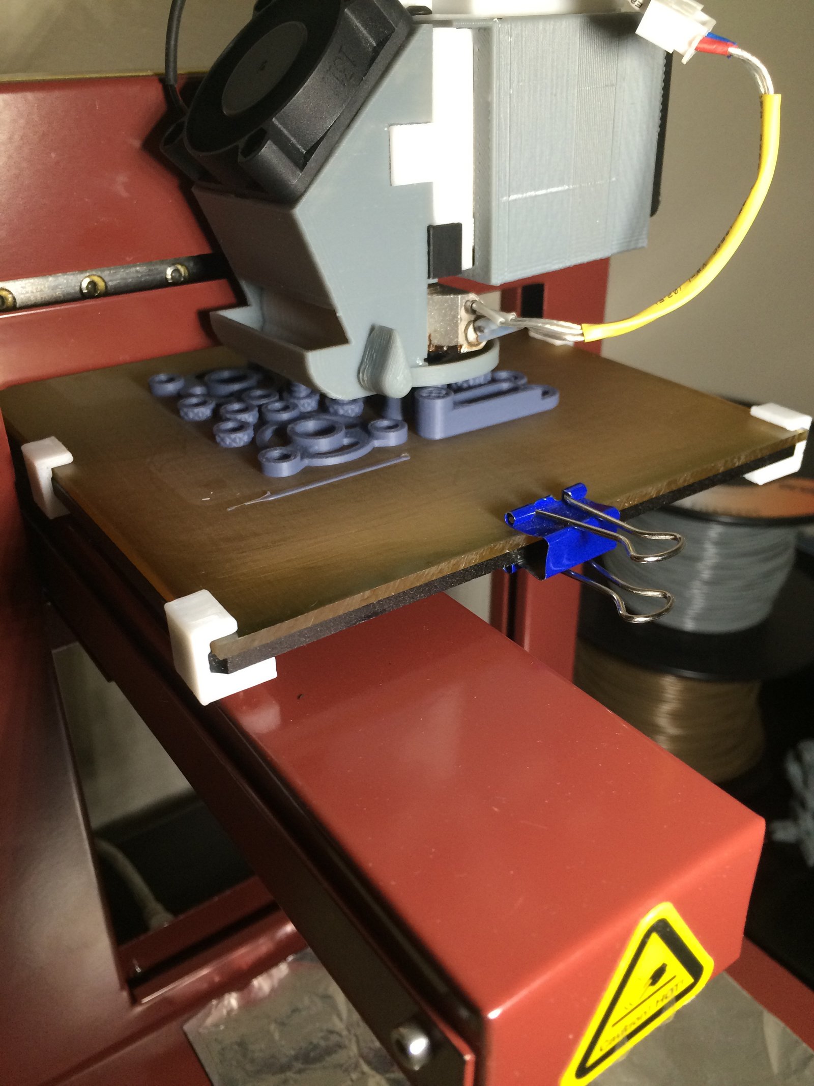 PEI, you find it at Amazon 0.1 inch thick, made some ABS clips to slide it in n out of the platform and hold it tight on the front with a paper clip. It comes glossy like glass, I sanded it down with 400 grit to have a smooth but flat finish. Don’t need to squish the material, actually give it enough room to lay down nicely. Let the bed heat well, make sure you are dead level too and go. ABS, PLA and HIPS stick perfectly, when the print is done, remove it, let it cool and flex a bit. That is it parts just pop off the plate. See pic.