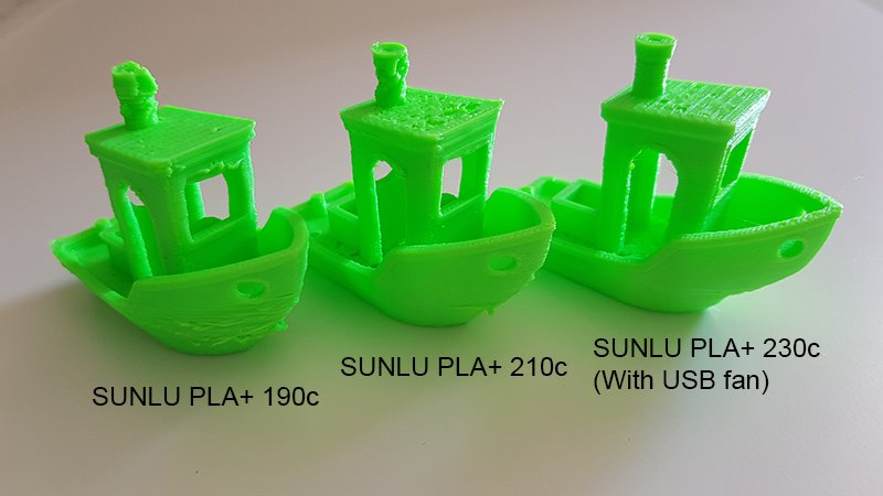 So yesterday I bought some SUNLU colour PLA+ filaments. Again I noticed poor print quality at 220c so I printed at 190, 210 and 230 and the results are here: