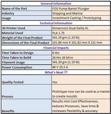 The ‘FOS Pump Barrel Plunger’ came with the parcel assigned by the Indian Navy with another 100s of machine parts. The complex shape of the part made it impossible to directly cast and manufacture it, especially because there was no cast ever made or probably unavailable in the market. The problem was identifying the material used, create a design avoiding the calculations of the wear and tear over the years and then test the fully functional part made of metal !!