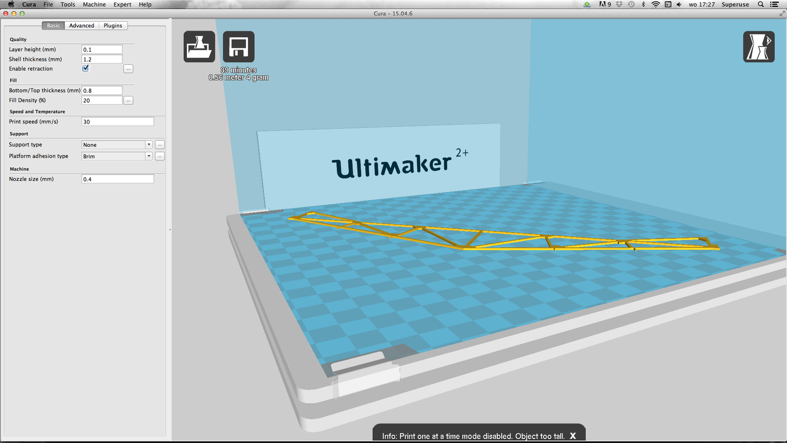 Met een MultiMaker 2+ extend willen we een obj. file van SketchUp printen dmv Cura.
