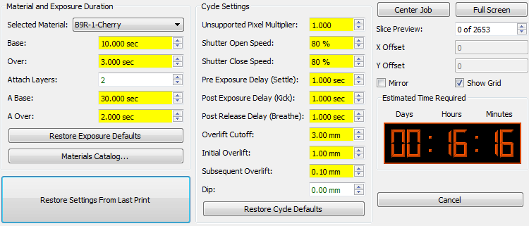 Download this Calibration Matrix http://www.thingiverse.com/thing:165389 and print it when you’re not sure what settings you need for your next print. It’s a 2-5 minute print, it’s dimensions are based on pixel matrix so the minimum feature will be one row of pixels, no matter what Pixel Size Setup you’re calibrated. You can easily tell, from how the features came out, If you need thin spaces between features you need to lower the exposure times, and if you need very thin features you gotta elongate them. With experience you’ll know the best settings just by looking at the model…