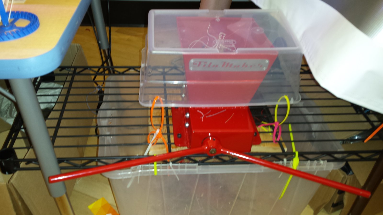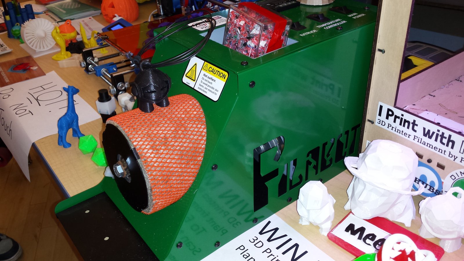 The kids who stopped by the booth were invited to help grind scrap ABS with the 3DHubs Fila Maker while we explained how we would use it in the 3DHubs Filabot to make more filament for new prints.