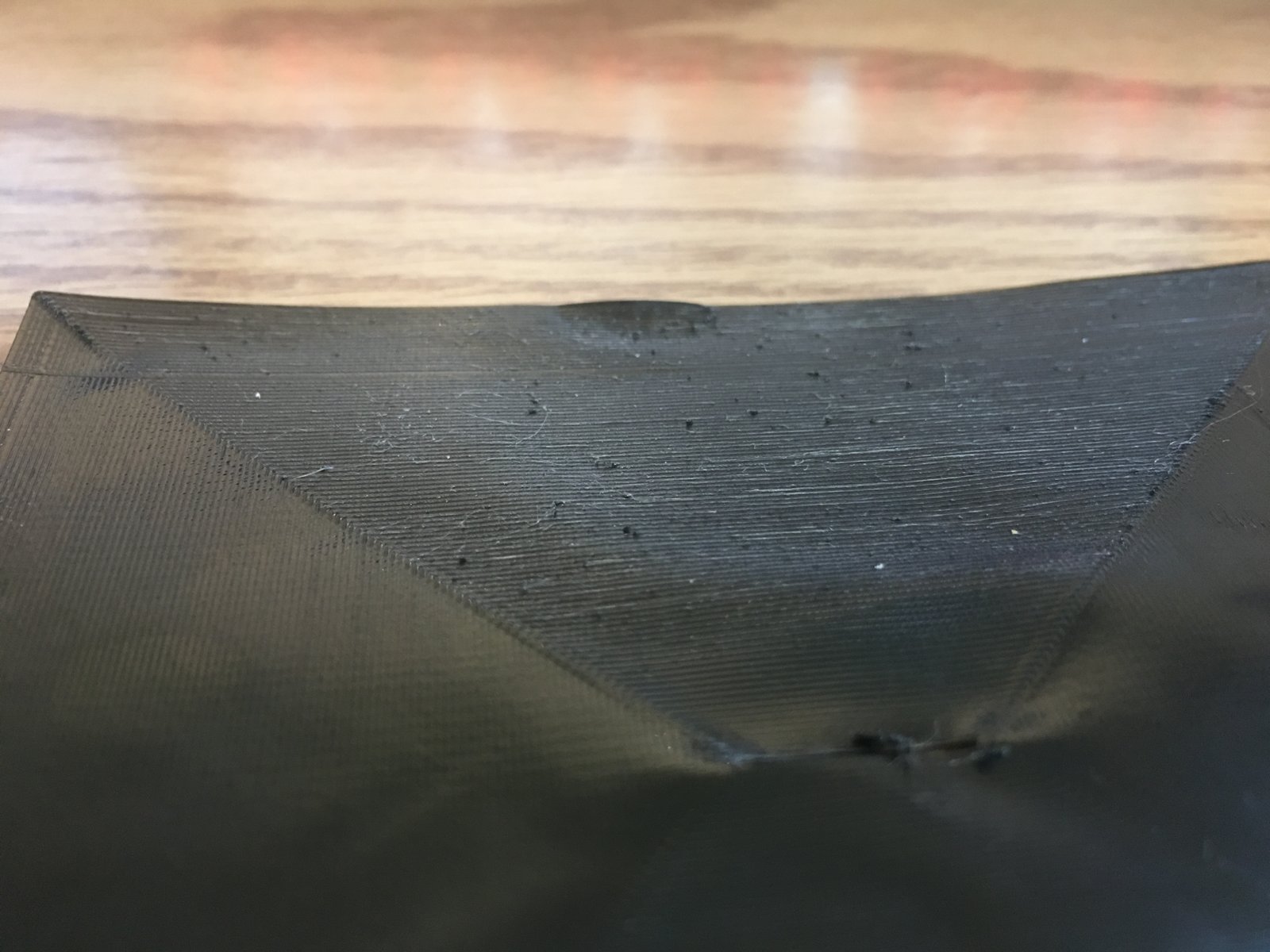When printing the model (and other flat plane, think drawers or boxes) models I have a weird pattern (grainy/stringy texture) being laid down only when the extruder extrudes from right to left. (please see top section of picture 1, compared to the bottom section.) If I extrude at ridiculous temps it doesn’t seem to do it…