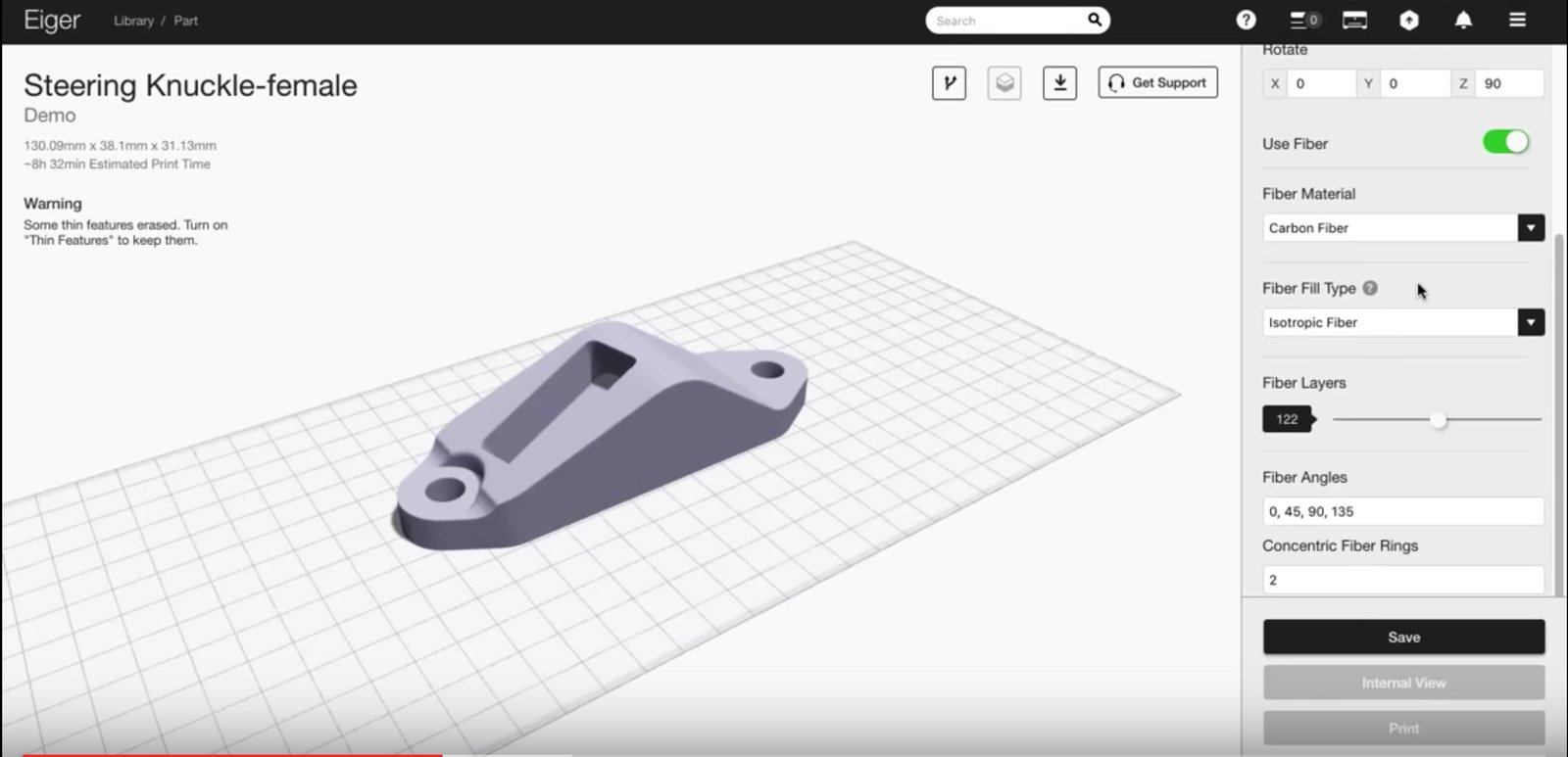 Nick: We have some questions about Eiger’s compatibility with other printers and if you can use other slicing softwares on Eiger or with Markforged printers. The answers to those are basically Eiger only right now is for Markforged printers. There might be a time that it makes sense to look at that for other printers, but right now this is our system. Eiger only works with Markforged printers and also Markforged printers only work with Eiger. That being said, people do ask me that question quite a bit, and the answer truly is that other slicers are not prepared to deal with fiber. We’re the only people that can do the fiber pathing and really other slicers wouldn’t know how to actually path fiber.