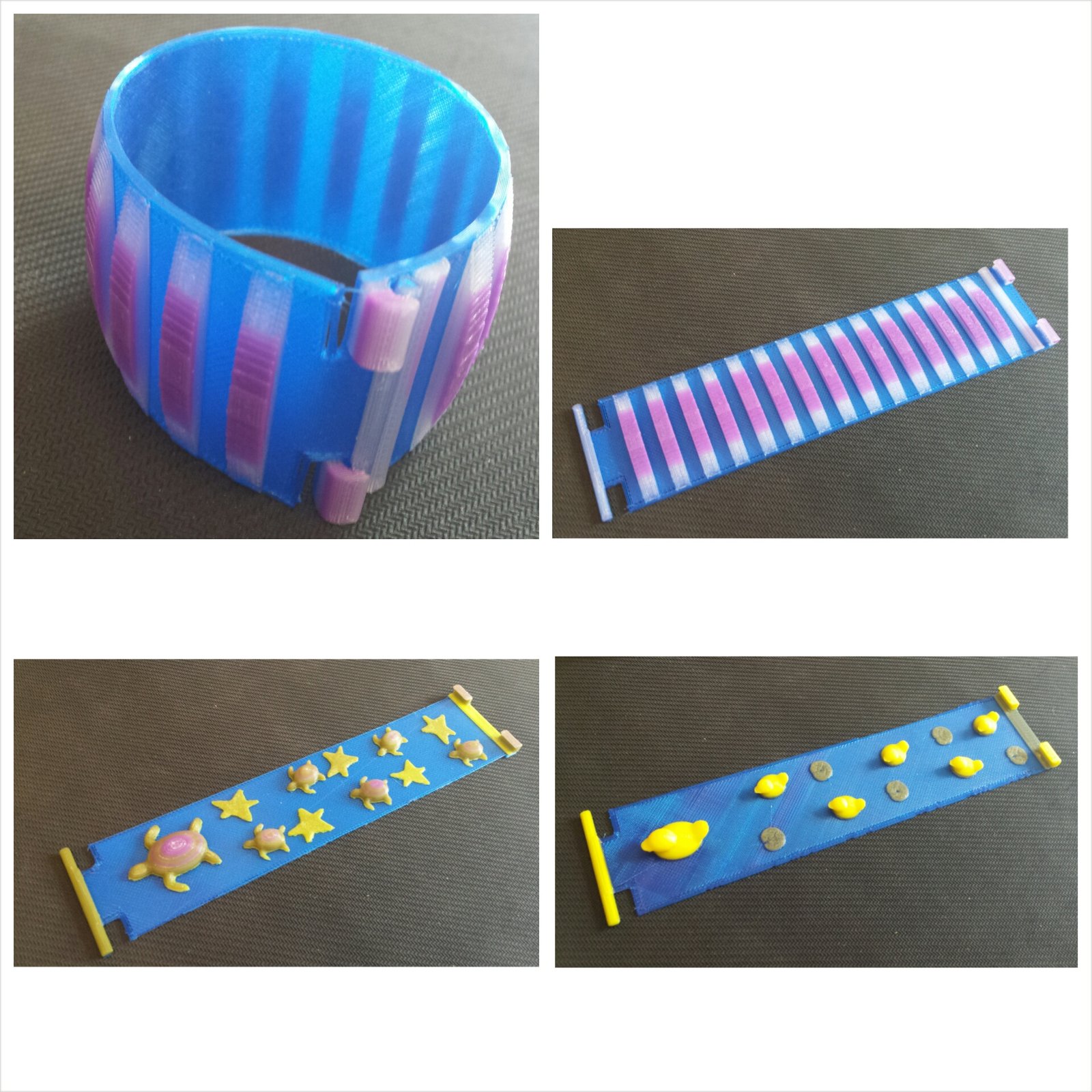 Bracelets I designed for Flexible Filament featuring some swimming Ducks, Turtles & Ridges. The color changes were produced by swapping filament to hard PLA plastic mid print. The clasp designed into this bracelet works best with the inclusion of hard PLA in the print but should function when printed in only Flexible Filament.