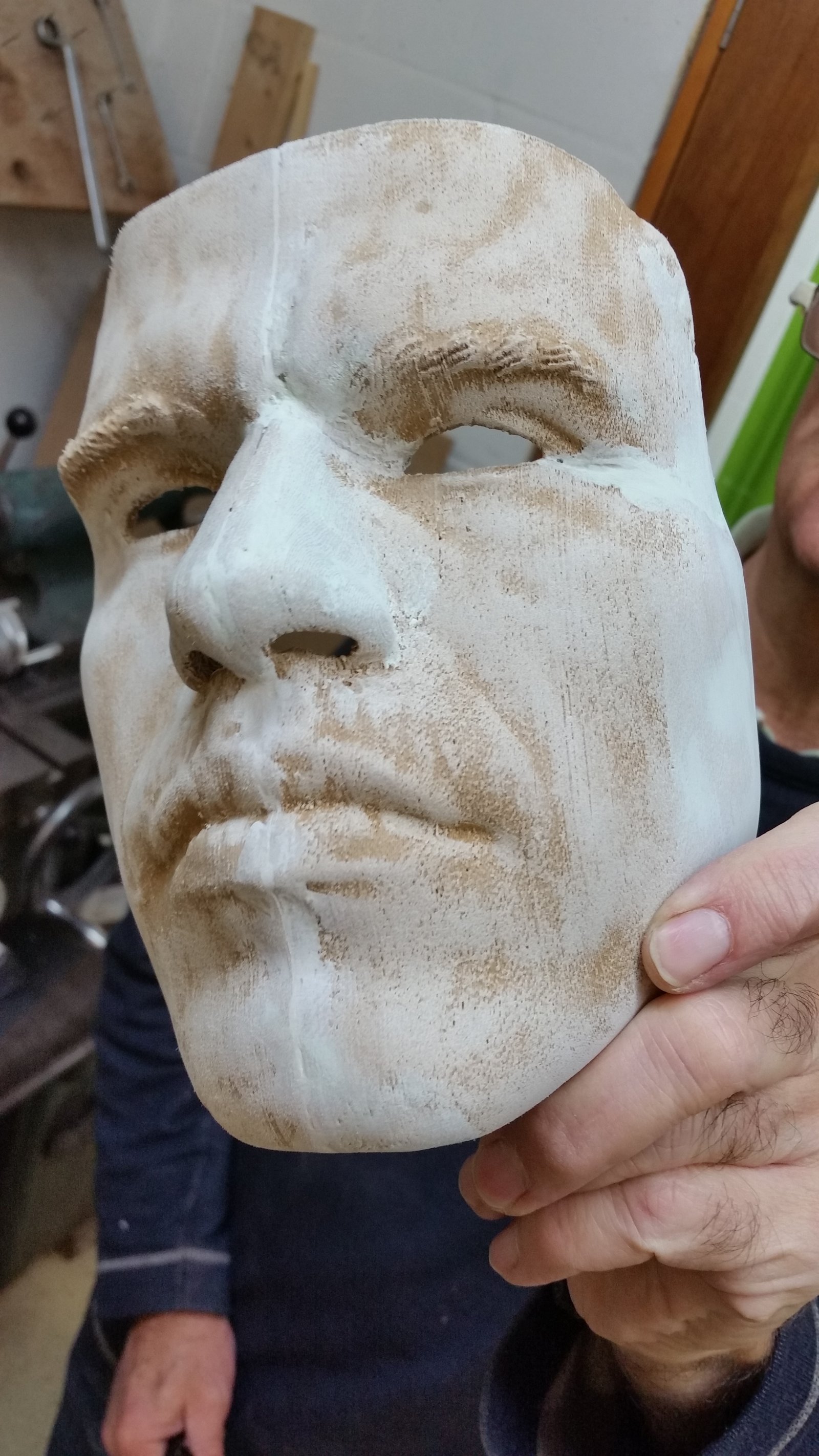To dress up as and surprise my friend, I made a 3d printed mask of his face. I had scanned his head a few months back so he could experiment with the textured mesh using different rendering and animation techniques, and had kept this all secret until Saturday night. Using my own face scan as a guide I could scale his up to fit my face.