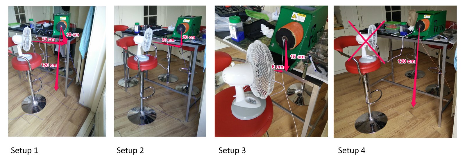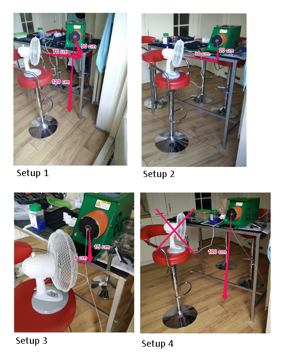 In total I used four different experimental setups that you can see in the image below. The only thing that varies is the position of the fan. For setup 1, 2 and 3 the 30W fan is used at half power. In setup 4 the fan is not used. In all setups the nozzle of the Filabot is placed 120cm above the ground.