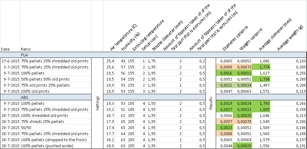 - Mixing shredded old prints with new pellets to produce new filament can give very good results.