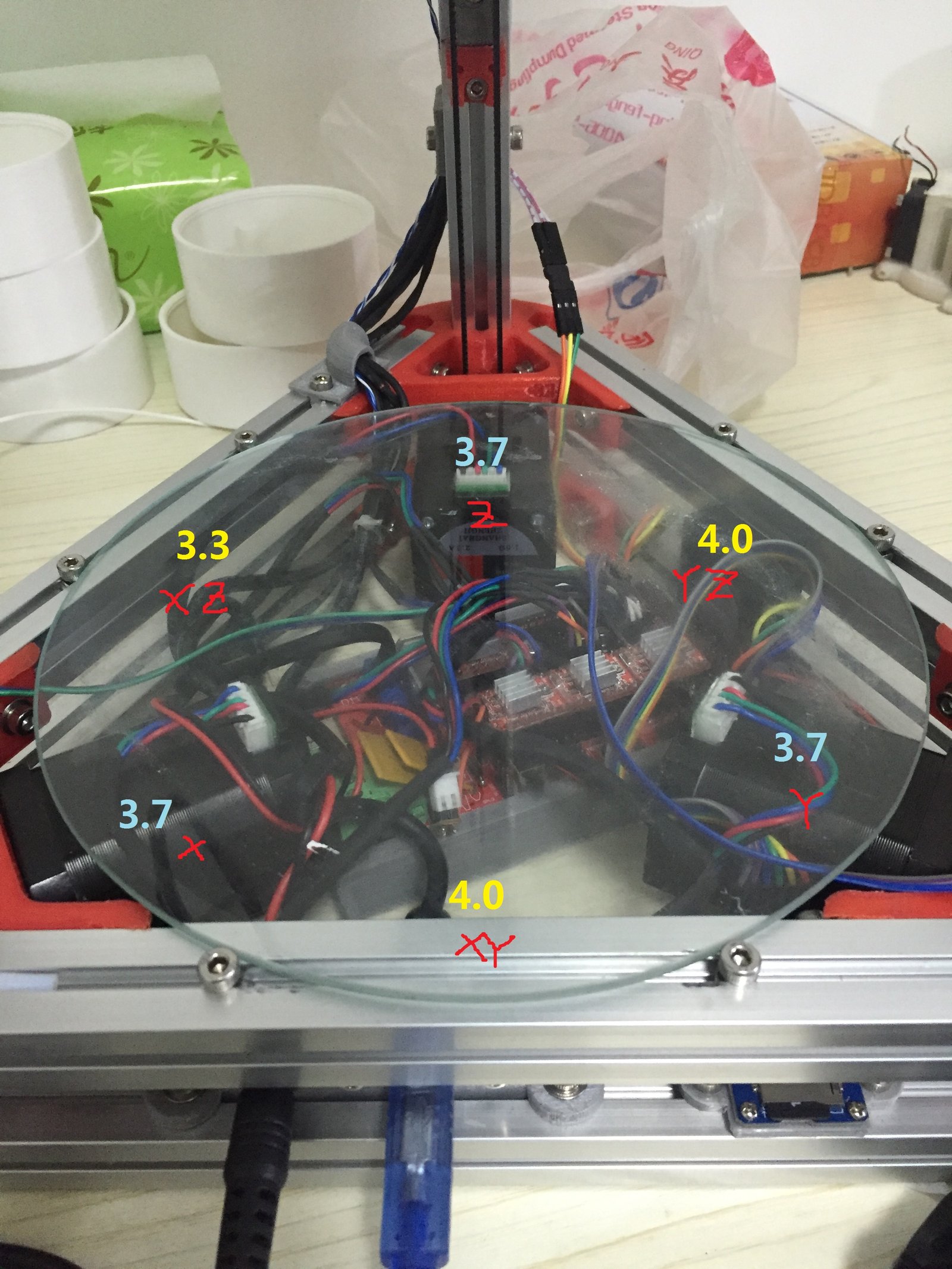 When I try to calibrate the level of the printing platform, I find the following issue: The mid point of X-Y is higher than X and Y. The mid point of Y-Z is higher than Y and Z. The mid point of X-Z is lower than X and Z. Why this happens?