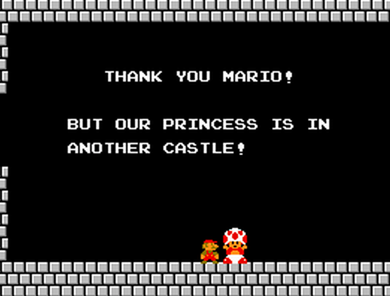 World famous TV game Super Mario Bros, we are trying to rebuild this scene. A mushroom baby always sit in the castle. After Mario clear 1 step, he meet her and get an information below: