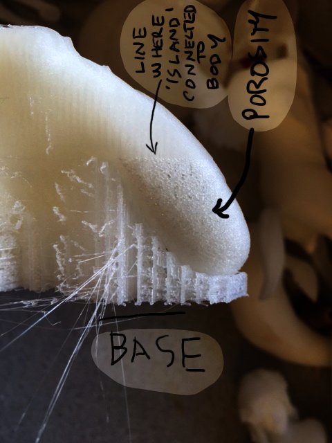 Cura, standard setting in QuickPrint. Type a Machine, Large 11" print. Starting out, small separate part of print lowest is very porous, but once it joins up with main body of print everything becomes normal.