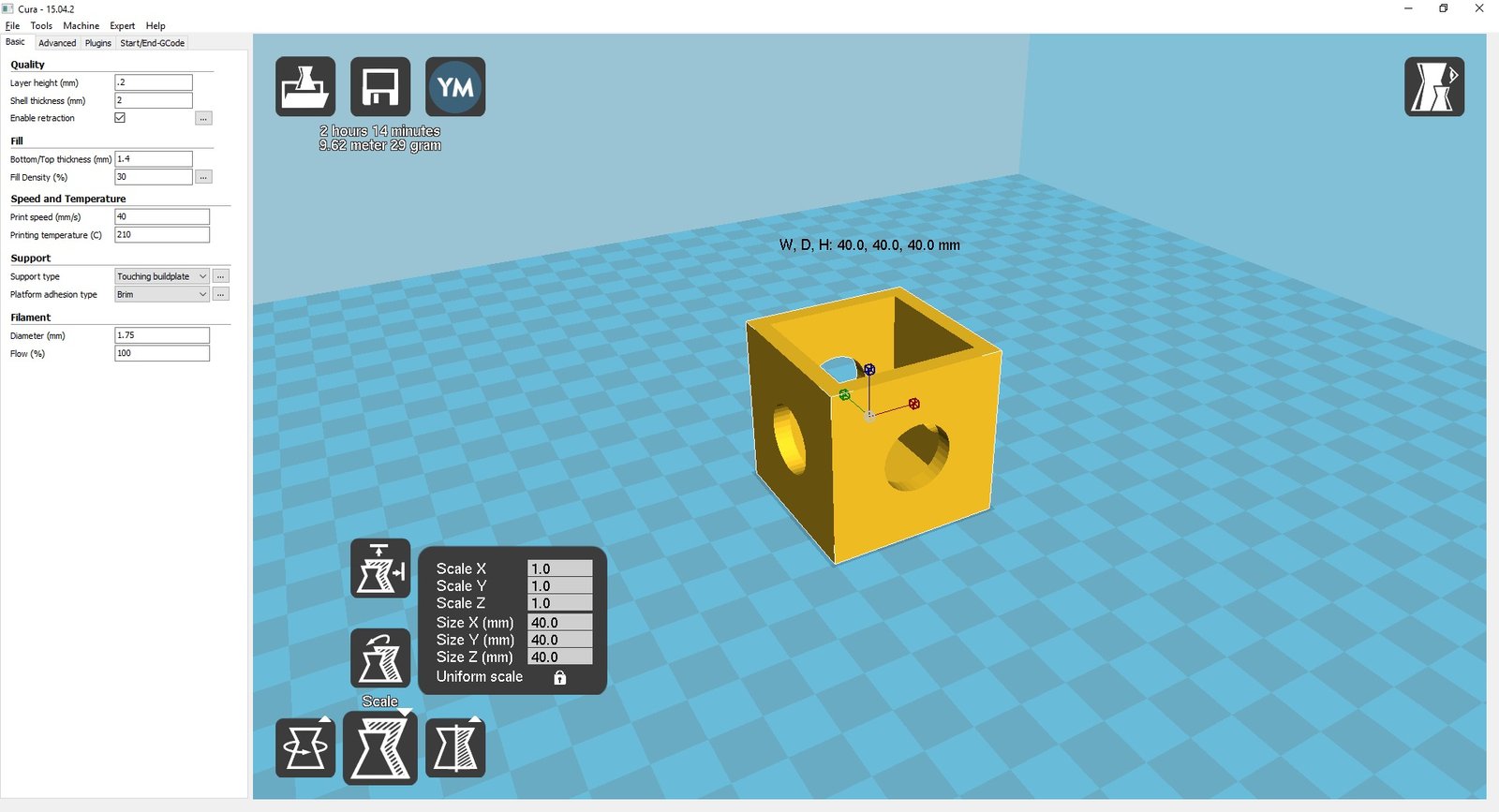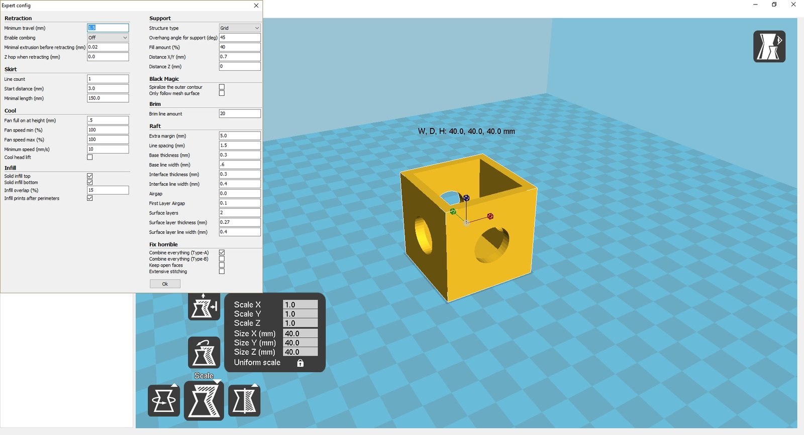 Here is 20mm cube to test you can scale it up from 20mm to 40mm http://www.thingiverse.com/thing:1366547