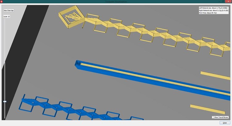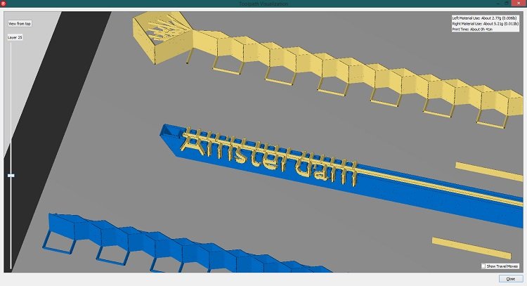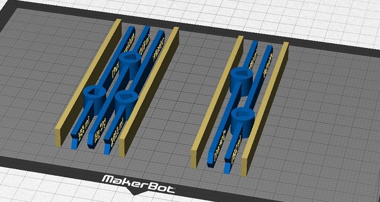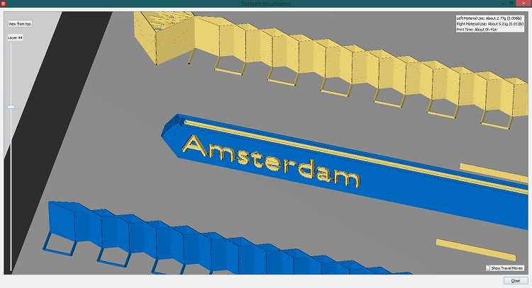 The first thing we did was layout the sign pointers in tight bundles of 3 or less. They were grouped and positioned on the build plate so when one print head was in use, the other was not getting dragged over any sign pointers. This solved the text shadowing quite nicely. To eliminate the schmutz, we added extra purge walls in the text colour to reduce oozing and to frequently wipe the nozzles, keeping them as clean as possible.
