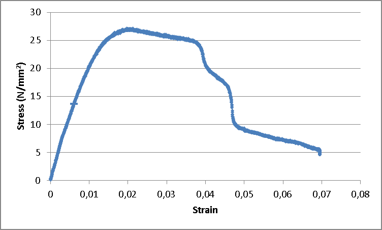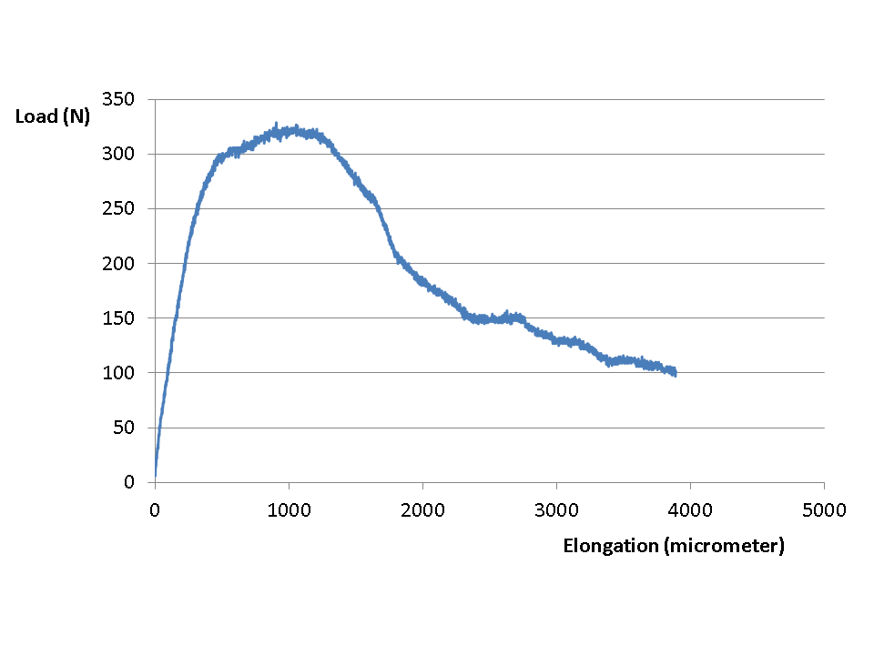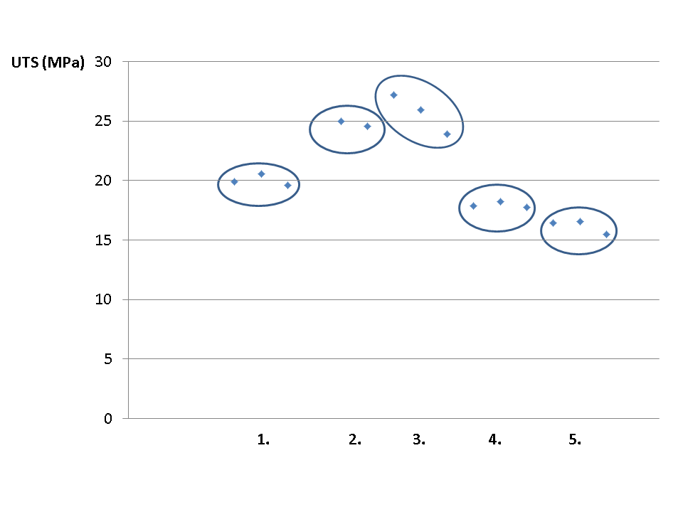 You can see that the load is increased until a certain point after which the load evens out and starts to decrease. The maximum load is used to determine the UTS. After some analysis this figure shows the Ultimate Tensile Strength for the different experiments: