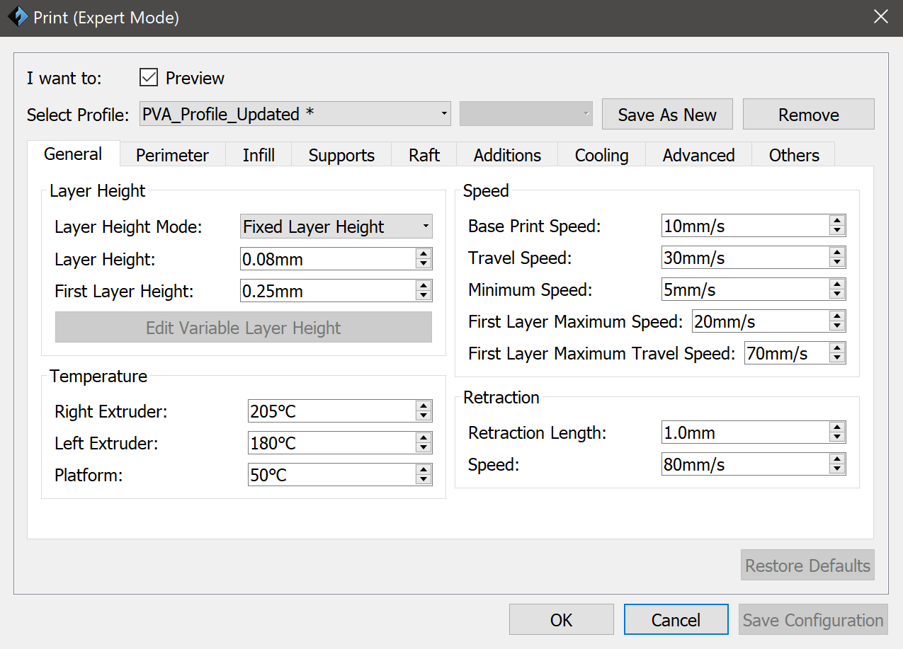 I’m having some issues trying to Print PVA with PLA in my dual extruder Creator Pro. I’ve attached a screenshot of my speed and retraction settings as well as temps. I’m using a black masking tape on the print bed, because that’s the only tape I have that the PVA will stick to. It won’t stick to the factory bed.