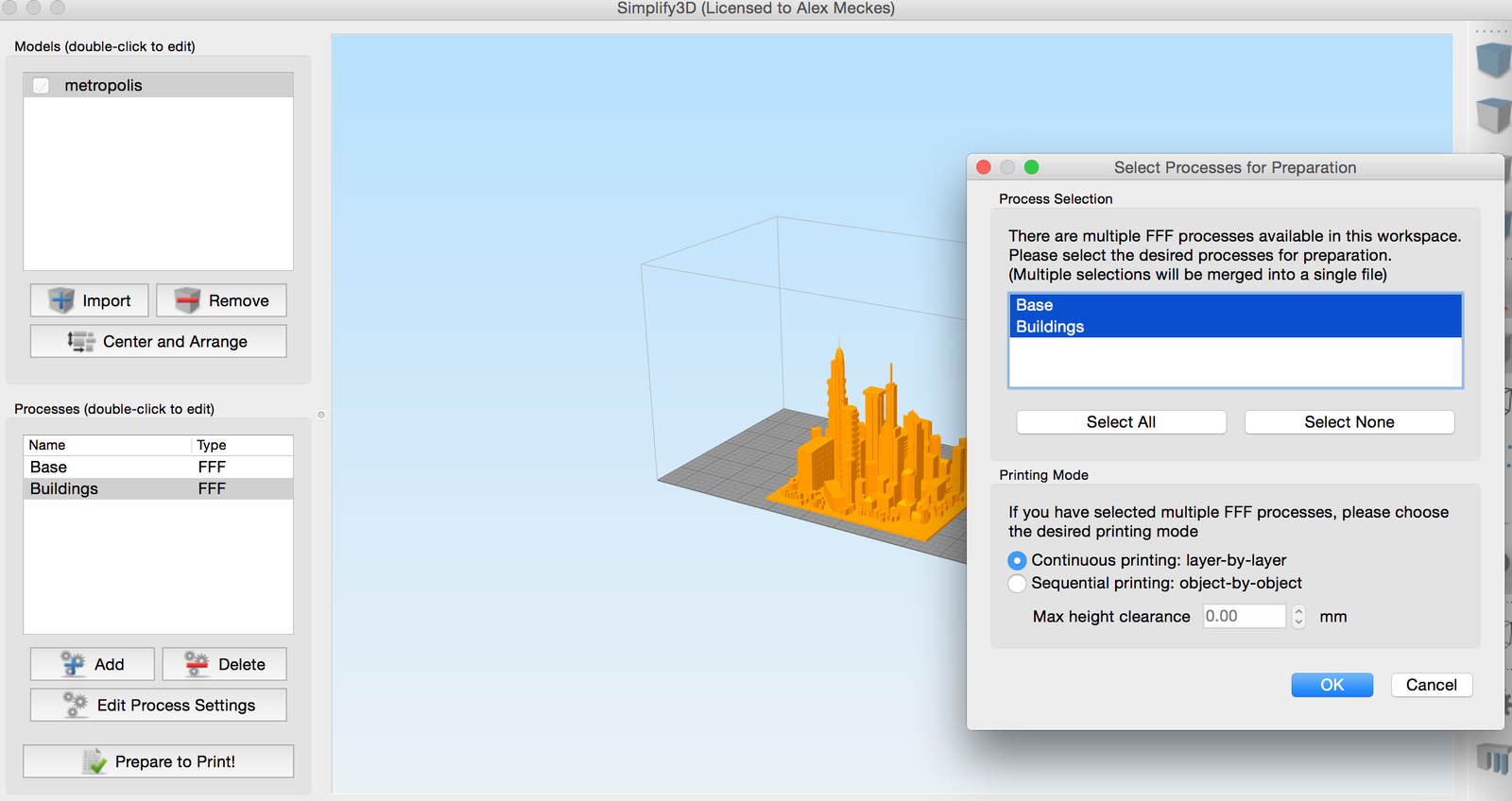To do this is you have to “start printing at height” and “stop printing at height” at the layer you want to switch settings. With multiple settings achieved, when you move to the prepare to print section, a new dialogue box will appear. Select both settings and then the continuous printing .