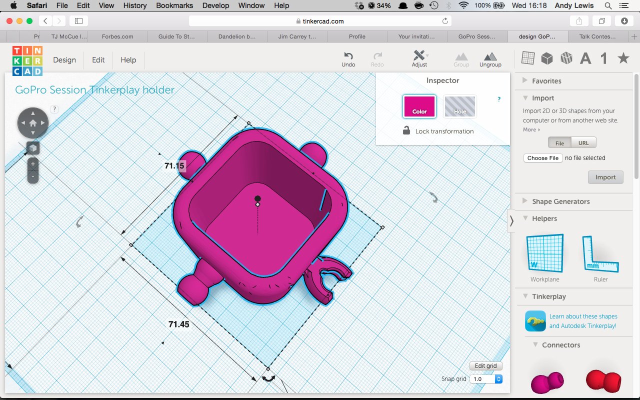 OK! Here we go! Admittedly, Iâm not the greatest CAD designer on Earth. Probably not in my street but, hey! Hereâs my entry. Itâs a holder for the new GoPro that can be used as a Tinkerplay component. I designed the case in Fusion360 ( 45x45x40mm with mainly 12mm fillets minus 35x35x35mm with 7.5mm fillets on 4 sides ) ,exported it to STL, then imported that to Tinkercad and attached some Tinkerplay ends from the library. AaaaaaandâŠVoila!!