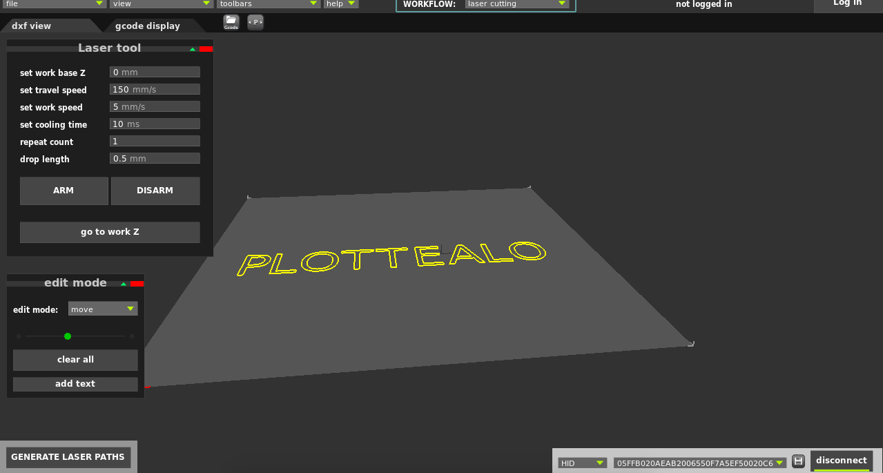 1. We have calibrated it like in the video, changing to the laser tool properly, preparing the DXF file for print and arming the laser.