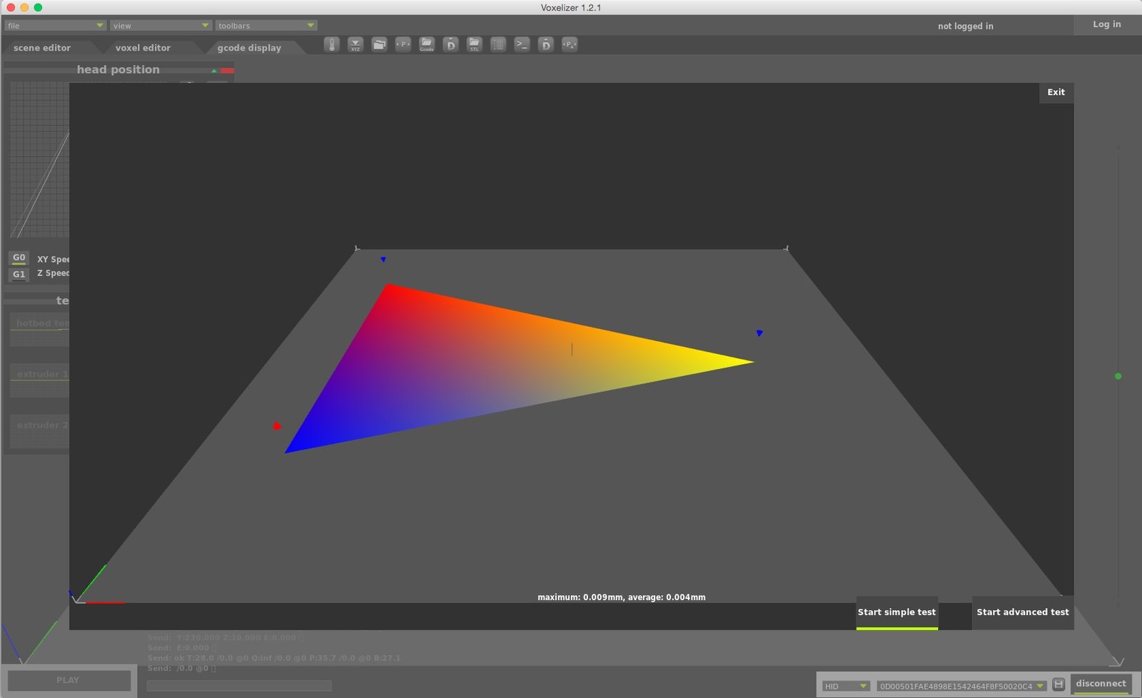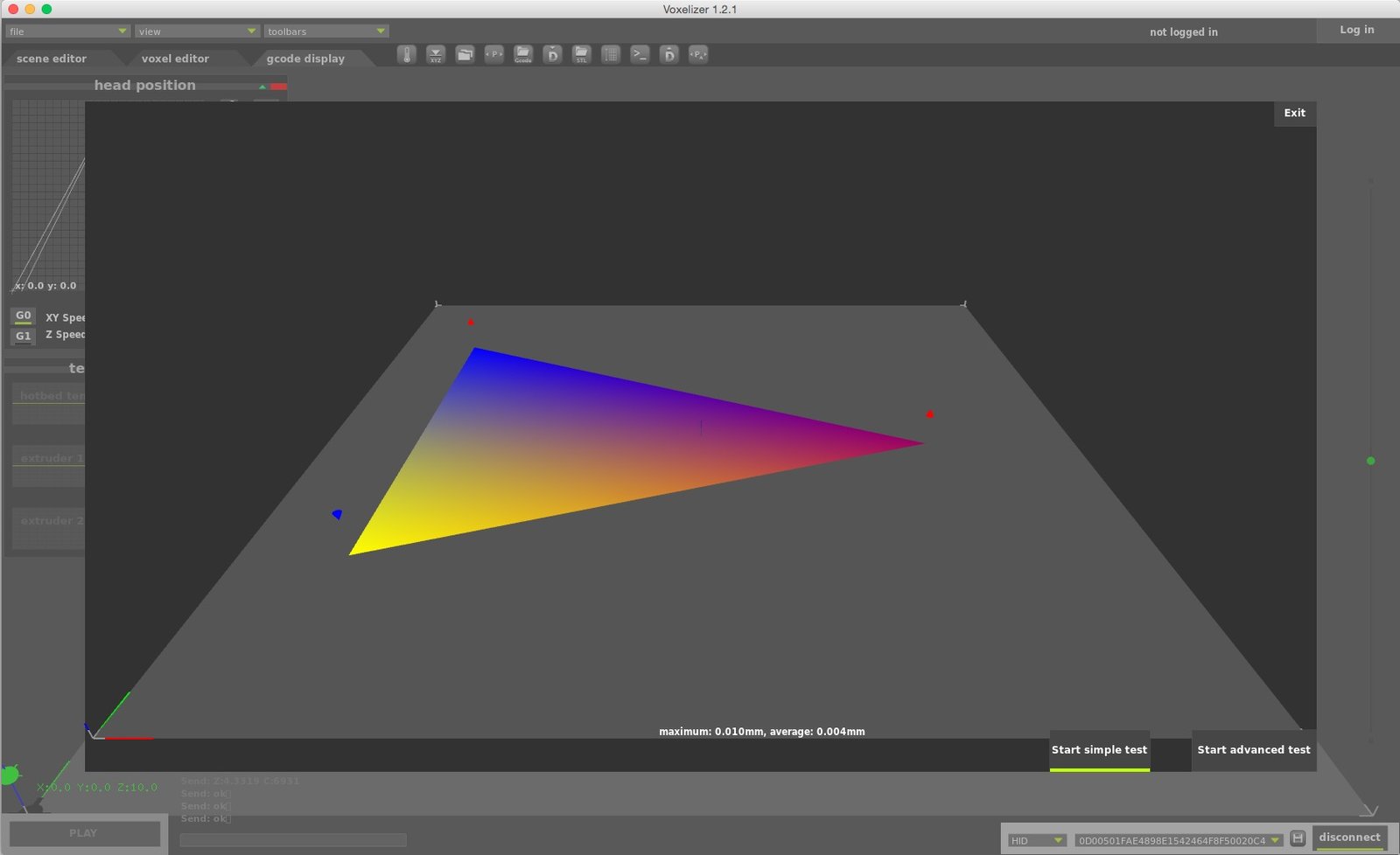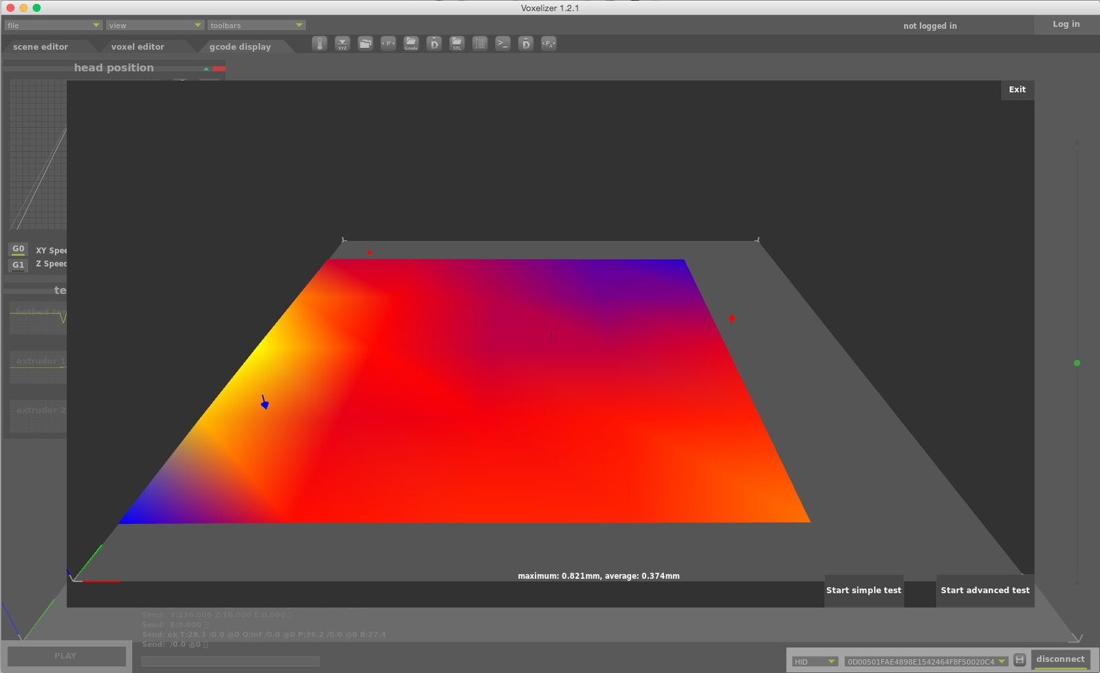 The simple test measures the relative height of the bed at three points, close to the screws that hold the platform and are used to adjust it. The advanced test measures 25 points all around the bed. After you’ve completed the first simple test you’ll see something that looks like a heath map. The blue and red arrows indicate whether or not to loosen or tighten the screws.