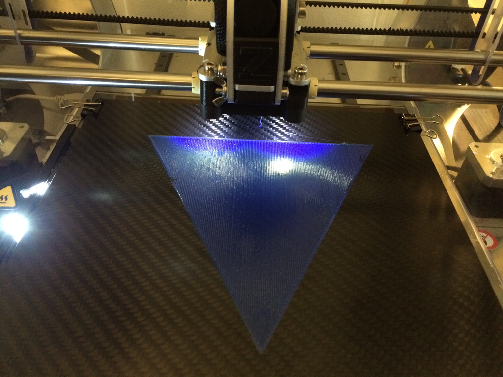 To see if the whole process worked we printed a calibration triangle, the Gcode for the model was already on the internal memory. It’s not very visible on this picture because of the lights, but the result was pretty nice without loose spaghetti.