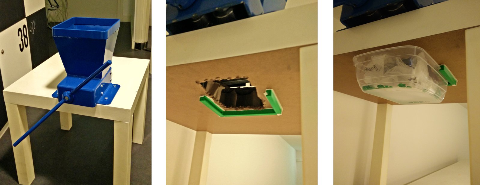 Last week it arrived at our HQ so I decided to start testing it out. First though I figured a couple of simple modifications would make the shredding process a lot easier. I bought a small table and cut a hole in the middle of it. Then I screwed the Filamaker on top of the hole and printed a holder so that a box can be placed at the bottom of the table to collect the shredded pieces.