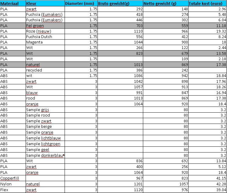 Wegens verhuis naar het buitenland heb ik ook een hele hoop rollen filament op overschot. Zie bijlage voor diameter, kleur, gewicht en prijs