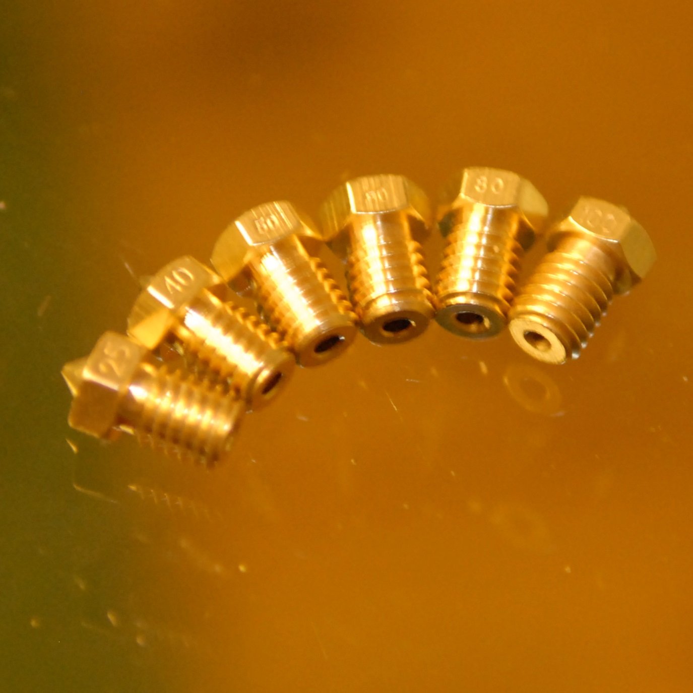 Er zijn Nozzles ter beschikking met een grotere en kleinere diameter dan de standaard 0.4mm Nozzle. De Nozzle van 0.25mm is meer geschikt voor kleine en zeer gedetailleerde prints. De resolutie wordt niet groter in XY richting, aangezien die voornamelijk door de steppermotoren en pulleys worden bepaald. Echter, het effect op hoeken en dunne wandjes is aanzienlijk. Het is hetzelfde verschil als tekenen met een scherp potlood en een dikke viltstift bij wijze van spreken.