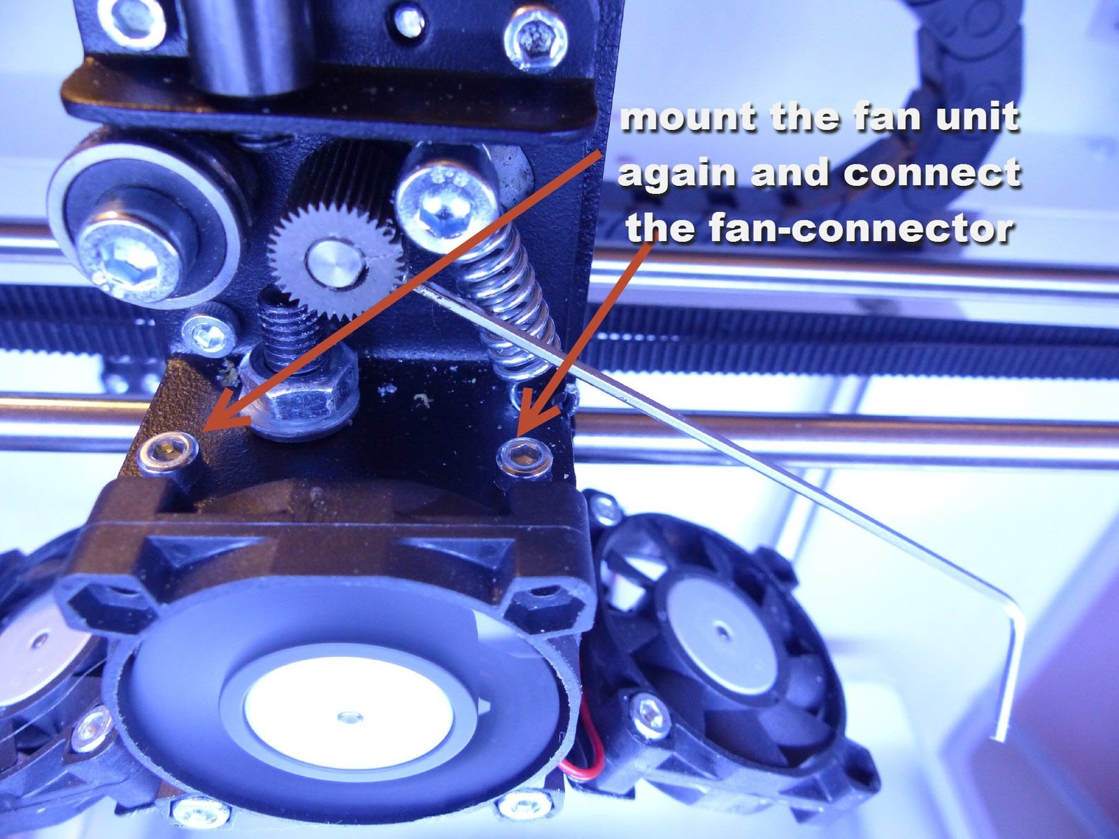 Om iets beter toegang te hebben tot de Nozzle kan eventueel de ventilator set tijdelijk worden verwijderd, door het iets losdraaien van de twee bovenste inbus boutjes. De bijbehorende bedrading kan losgemaakt worden middels de steker. Uiteraard na de vervanging van de Nozzle de ventilatorset terug brengen. de extruder heeft de koeling van de middelste ventilator nodig om goed te kunnen werken. Zonder ventilator zal de extruder snel verstopt zijn.