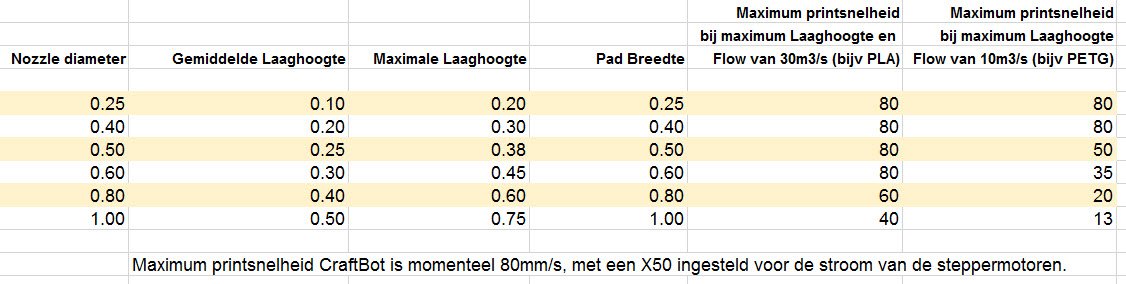 Betreffende instellingen in de slicer betreffende verschillende Nozzle diameters, kunnen de volgende instellingen als uitgangspunt genomen worden. Uiteraard aangepast naar specifieke wensen en resultaten.