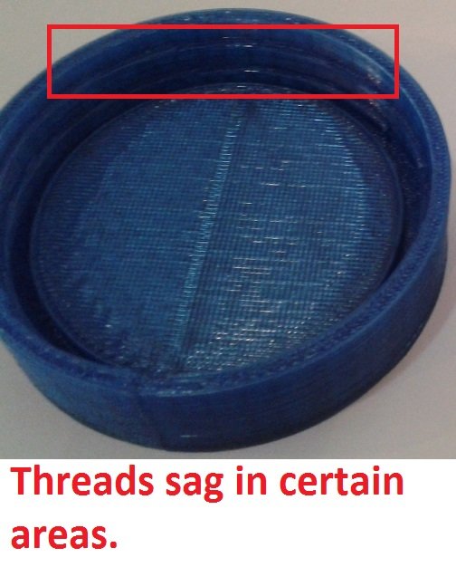 Photo 3 is my problem. Im trying to create a lid for a bottle and the threads inside the cap droop when printed out. Usually with ABS or PLA slight overhangs such as these arent a problem. But because the T-Glase is so much more like “sticky” it tends to be horrible with even slight overhangs and bridging.